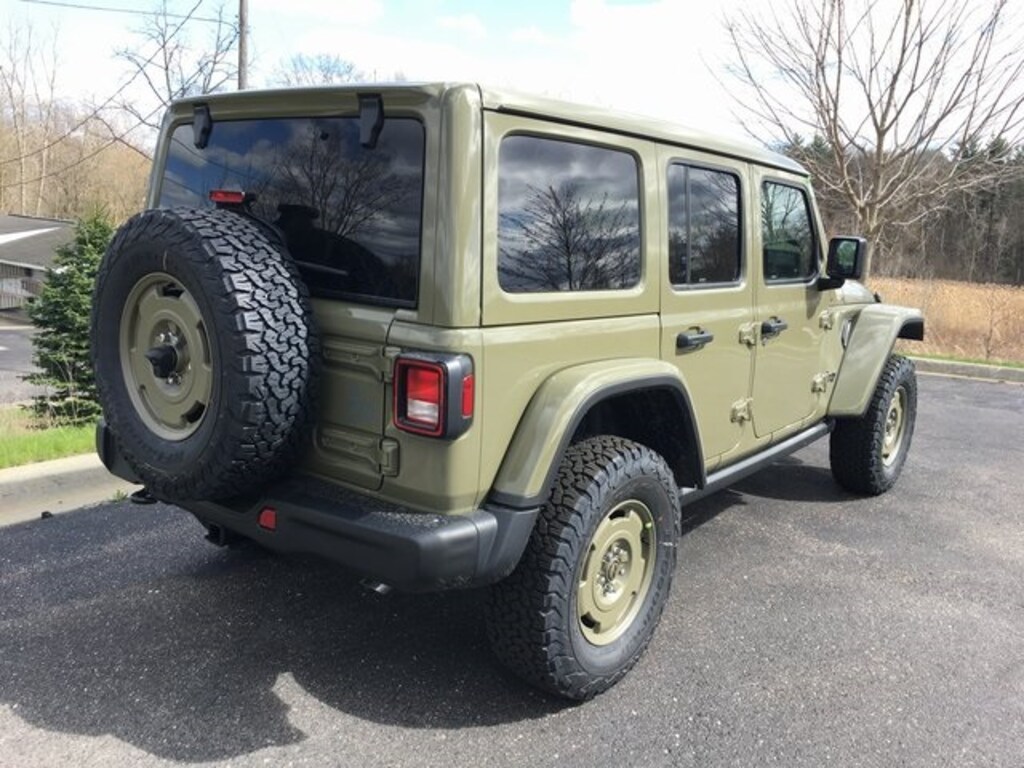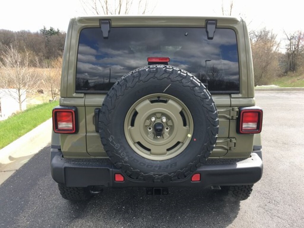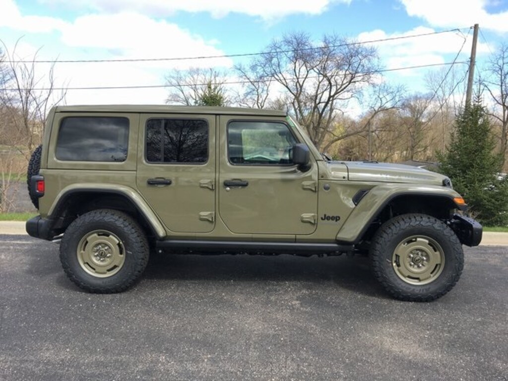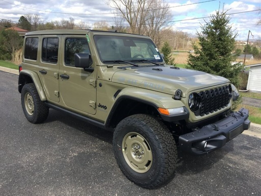 With some available options like Convenience Group (2-Door Passive Entry, Front Door Locks, Air Conditioning w/Auto Temperature Control, Air Filtering, Emergency/Assistance Call, Heated Front Seats, Heated Steering Wheel, Remote Start System, and Universal Garage Door Opener), Quick Order Package 29H Willys '41 4xe (4.10 Rear Axle Ratio, 4xe 4WD Willys '41 Swing Gate Decal, 7 & 4 Pin Wiring Harness, 97 MPH Vehicle Max Speed Calibration, Auxiliary Switches, Body Color Grille w/Gloss Black Rings, Body Color Rubicon Highline Flare, Class II Receiver Hitch, Cloth Low-Back Bucket Seats (D7), Conventional Differential Front Axle, E-Locker Rear Axle, Front LED Fog Lamps, Gray/Black Trail Rated Badge, LED Premium Reflector Headlamps, Matte Black Jeep Badge, MOPAR All-Weather Floor Mats, Off-Road Plus Mode, Premium Tan Sunrider Soft Top (STC), Steel Front Bumper, Steel Rear Bumper, Wheels: 17" x 7.5" Painted Body Color, Willy's Suspension, Willys '41 Retro Edition Buzz Model, Willys '41 Retro Edition Hood Decal, Willys '41 Retro Edition PHEV Decal, Willys '41 Retro Edition Tailgate Plaque, Willys '41 Retro Edition Wrangler Decal, Willys '41 Retro Shift Bezel Insert, and Willys '41 US Edition U.S Hood Decal), Technology Group (A/C Power Box Inverter (PHEV), Alpine Premium Audio System, and EV/PHEV Vehicle To Load), 3.73 Rear Axle Ratio, 4-Wheel Disc Brakes, 8 Speakers, ABS brakes, Air Conditioning, Alloy wheels, Apple CarPlay/Android Auto, Brake assist, Cloth Low-Back Bucket Seats, Compass, Delay-off headlights, Driver door bin, Driver vanity mirror, Dual front impact airbags, Dual front side impact airbags, Electronic Stability Control, Front anti-roll bar, Front Bucket Seats, Front Center Armrest w/Storage, Front fog lights, Front reading lights, Fully automatic headlights, Heated door mirrors, Illuminated entry, Integrated roll-over protection, Low tire pressure warning, Occupant sensing airbag, Outside temperature display, Overhead airbag, Panic alarm, ParkView Rear Back-Up Camera, Passenger door bin, Passenger vanity mirror, Power door mirrors, Power steering, Power Top Quarter Window Storage Bag, Power windows, Radio data system, Radio: Uconnect 5 w/12.3" Display, Rear anti-roll bar, Rear reading lights, Rear Window Defroster, Rear Window Wiper/Washer, Remote keyless entry, Removable Rear Quarter Windows, Security system, Sky 1-Touch Power Top, Speed control, Split folding rear seat, Sport Suspension, Steering wheel mounted audio controls, Tachometer, Telescoping steering wheel, Tilt steering wheel, Traction control, Trip computer, Variably intermittent wipers, Voltmeter, and Wheels: 20" x 8" Machined/Painted Gray.